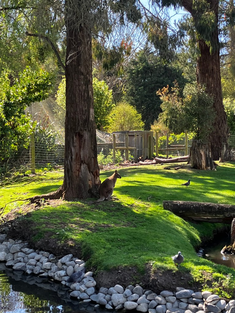 After we exited the boardwalk, there were some small deer – brought here and bred for game – and then an area where you can walk among wallabies. There are lots of signs warning not to let the wallabies out, but they weren’t feeling very feisty this morning and stayed away from the path.