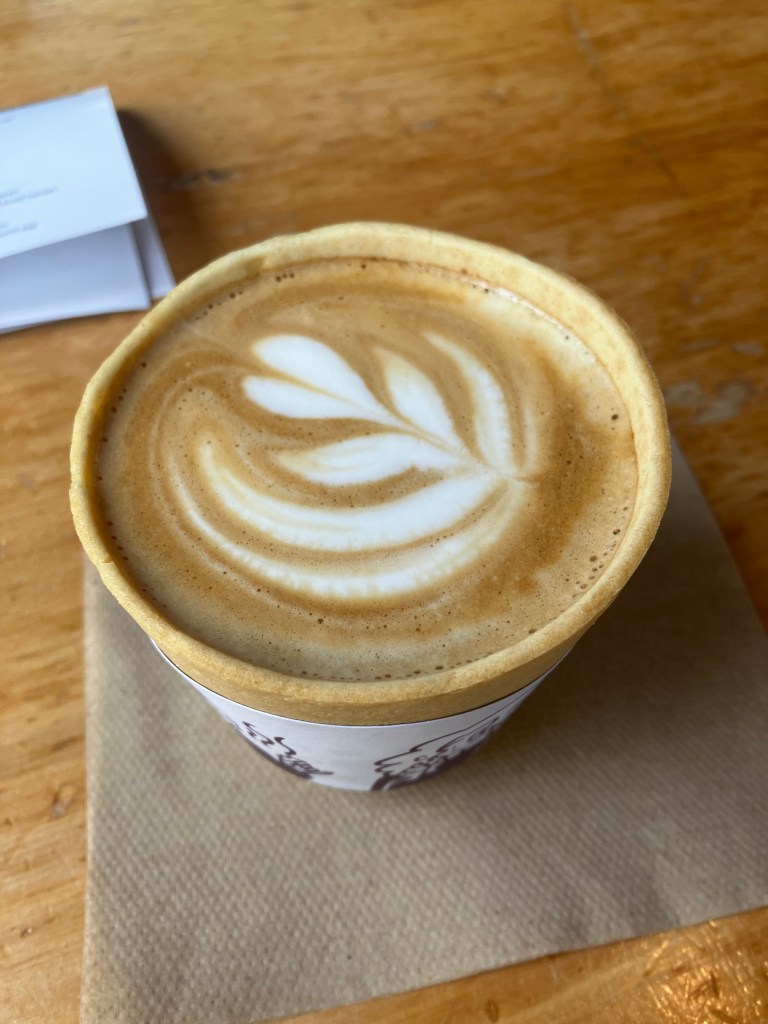 Then we were done! We wandered down to the cafe for lunch, it being nearly 1. I ordered a delicious seafood linguini, and a flat white in the edible cup they advertise. The edible cup is simple, really – just a tooled up version of an ice cream cone!