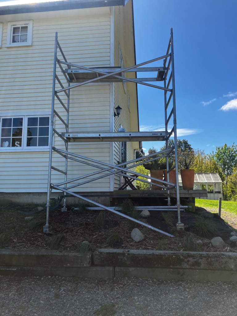 After that, I was handed off to Gary for more painting tasks. The big one was the cornerboard on the 2-story cabin, which the tradies had replaced. Gary had put up a scaffolding to match, lashed it to the building with a ratchet strap, and put a single deck on it. Tada, your working platform. Regan refused to paint it because he’s scared of heights, and Ethan refused to paint it “because he’s not good at cutting in” (because obviously people will be checking the white-on-white paint job behind the building).