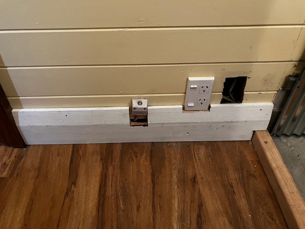 The wood was rotten and splintery. Luckily, I had erred on the side of caution and measured the notch slightly small, so I could clean it up with sandpaper. It’s wasn’t the nicest thing, but pretty good for a first attempt. My biggest problem is that the wire for the TV goes through where the baseboard should be, so there was no option but to notch it below the level of the wall.