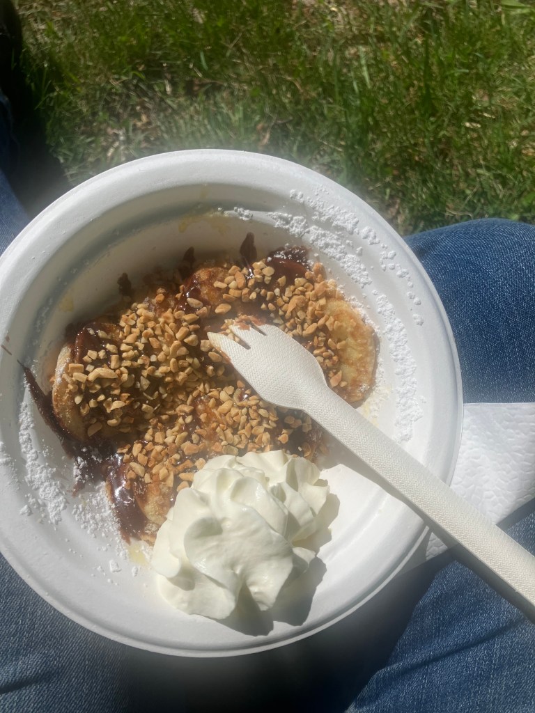 Standard fair fare; booths selling soap, homemade wine and cheese, little crafts, a book sale, an auction for furniture. A bouncy castles and little train for kids.