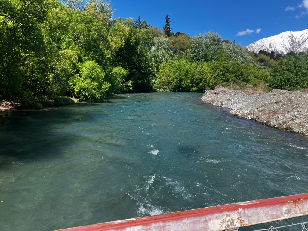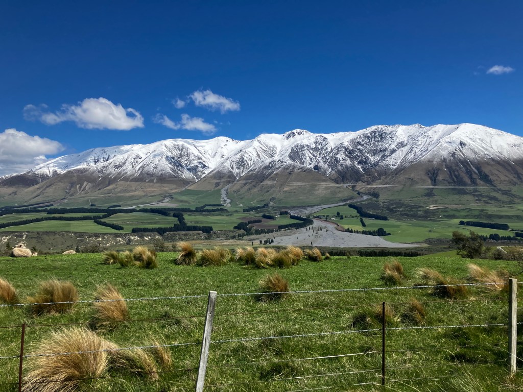 The road winds away into the mountains, following the Rakaia river into the heart of the Southern Alps. But it doesn’t have an elevation gain, so it’s still nice and warm and flat while you are surrounded on all sides by freshly snow-capped peaks.