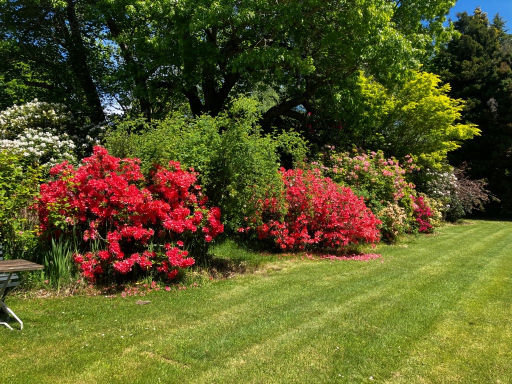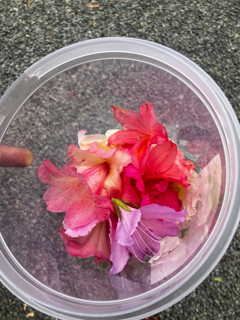 After I was done, I grabbed a bucket to gather some flowers. I was still a little bummed about not being able to bring the sheep skull home with me. The garden is awash with so many varieties of Azaleas and Carnelias and I realized that pressed flowers could be easily slotted into the pages of a book to bring home. Yes, you can grow Azaleas and the like in Canada, but these were from here! So I grabbed some pristine blooms that had recently blown off the bushes and brought them into my cabin, with some newspaper and parchment paper.