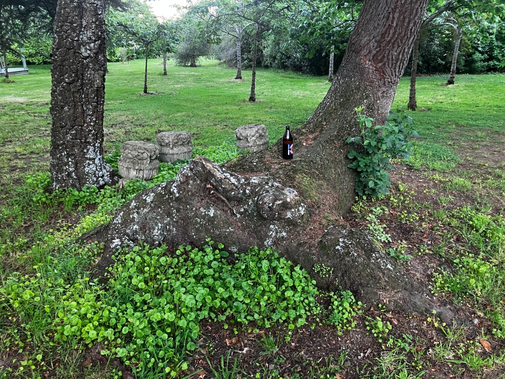I asked for and received a beer from Ethan. A giant, 750mls beer, which was much more than I needed, frankly. I opened it and decided to go out to the “where the fairies meet” tree for my libation for Luke. I noticed there’s a bit of a fairy circle of some flowers that only grow around the tree, which is interesting. I sat in silence for a bit, talked a bit, and poured out some of the beer. Then I walked back to my cabin in tears and drank the rest.