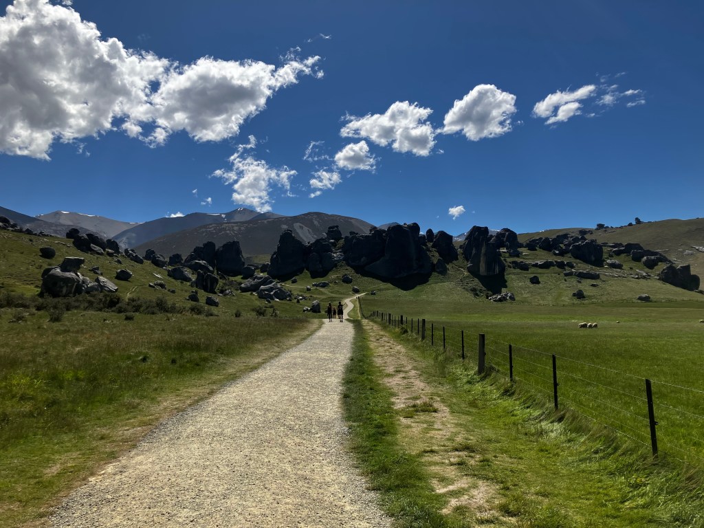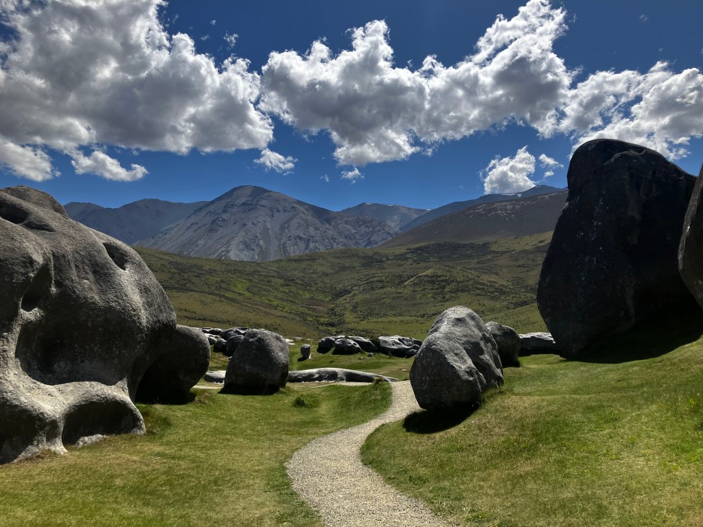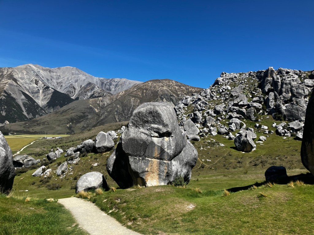 Castle Hill, and the strip along the road to Arthur’s Pass, seems to be unique in that the mountains on either side are fresh basaltic rock from the depths of the Earth, turning over as it rises. The section in the middle here is limestone, from 30 million years ago, before the Southern Alps started rising and this land was beneath the sea. It was the last great extinction event before the modern era; falling carbon dioxide levels caused the Earth to cool dramatically (dramatically meaning over the space of 400’000 years). The continued separation of the Australian and Antarctic plates opened up the Tasmanian Passageway, causing further cooling of the sea at the south pole and leading to the creation of the permanent ice sheet over Antarctica that still exists today. These limestones are the remains of 30 million year old sharks, that couldn’t survive the suddenly chilly waters and died en-mass and sank to what was then the ocean floor. Prior to this, Antarctica had a sub-tropical climate similar to Australia and New Zealand.