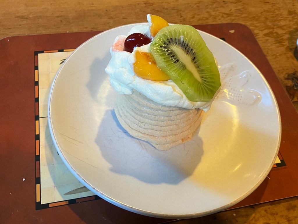 I pulled in to the driveway at 7:20, almost ran over Luigi like always (I’m glad he’s feeling better with the arthritis meds, but he’s a menace for attacking me on the bike), parked quickly and ran inside to strip off my biking gear. I was at the table before 7:30, although dinner was 20 minutes late anyway. We had… well, she called it hamburger, but we’d call it meatloaf in North America, with salad and a couple of pre-made pavlova’s that were going stale in the fridge. In case you didn’t know, pavlova originated in New Zealand, despite the Russian name!