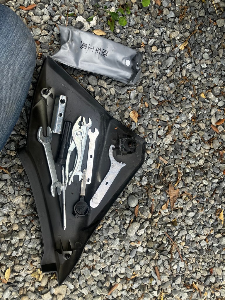 Well, I give up for tonight. My arms were absolutely burning from the tattoos. Even air moving across them felt like someone was rubbing them with sandpaper, nevermind trying to lay on gravel to look at the underside of the bike, and they were still weeping.