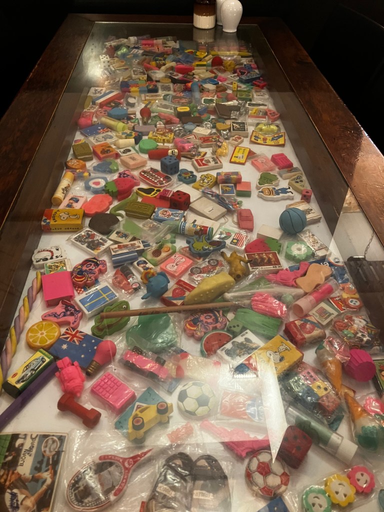Well, he made a halfways decent tequila sunrise. I noticed a table at the back that was full of erasers and spent half an hour in the bar, admiring the collection and trying not to drain the glass in one gulp. He kept coming by to chat with me, not that this place was hopping.