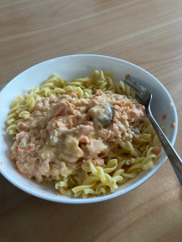 After all the usual purchases, I grabbed something called “salmon trim”, basically offcuts of salmon once they’d finished making those beautiful salmon steaks. I really like the idea and wish they’d do it in Canada. Actually, they probably do, but they hide them behind the counter so you have to ask for them cuz they want you to buy the more expensive steaks, like with fish heads. Since I had a whole bottle of cream for my tea, I’d make a version of the pasta sauce Simo had made a week ago. Cook meat, simmer cream until it thickens, add meat to sauce and let the flavours mingle, add to cooked pasta.