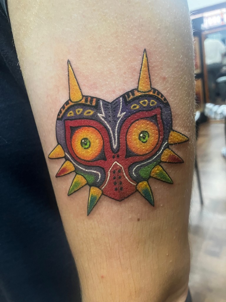 The shading was clearly where he shone and was passionate. His gaze changed then, became more focused. The details around the eyes I found particularly stunning, especially considering such detail was absent from the image I sent him; this was his personal skill, not just copying the stencil. It really sold me on the artist, because eyes are always the most critical thing to get right, but especially on the Majora, whose “eyes” literally bulge out of the shape of the mask.