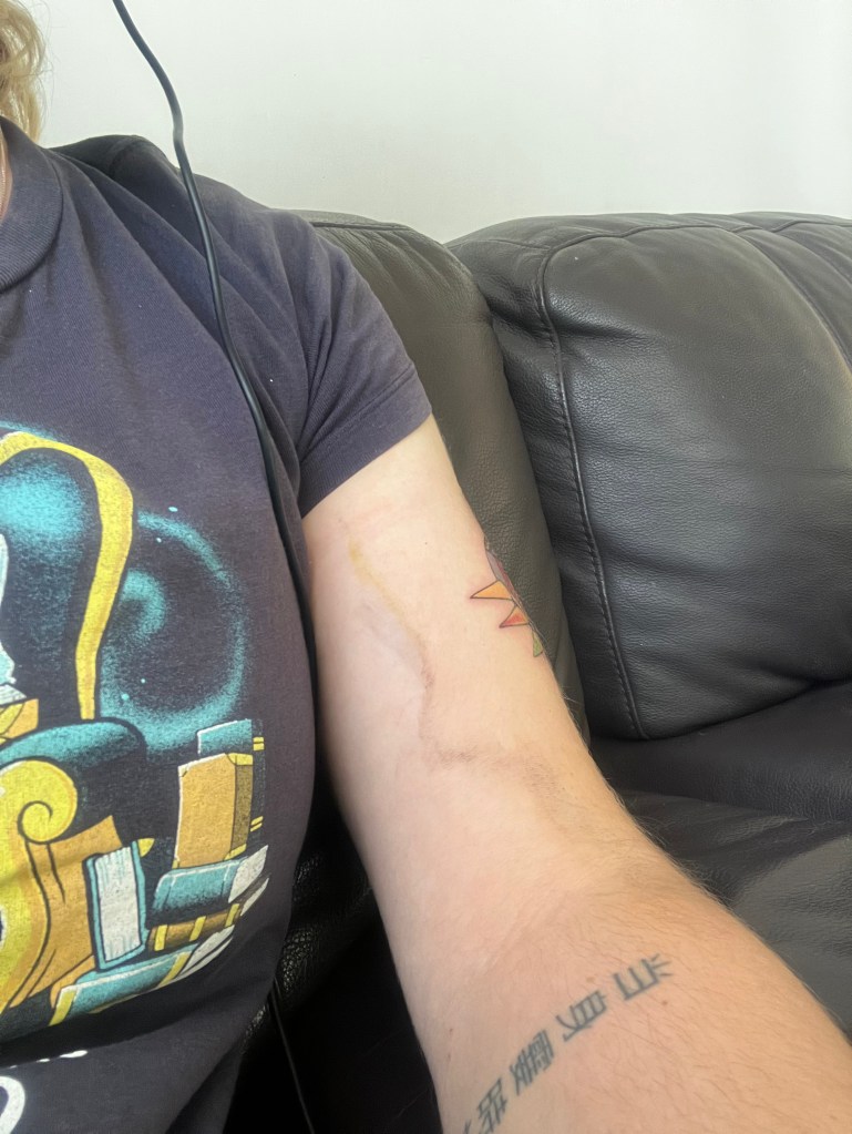 The skin of my bicep disappeared into a kaleidoscope of colours as he wiped away ink sitting on the skin to see where he was aiming.