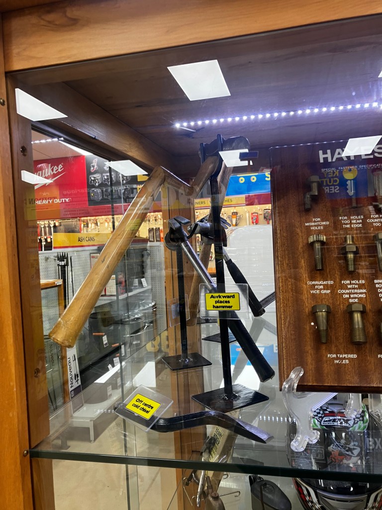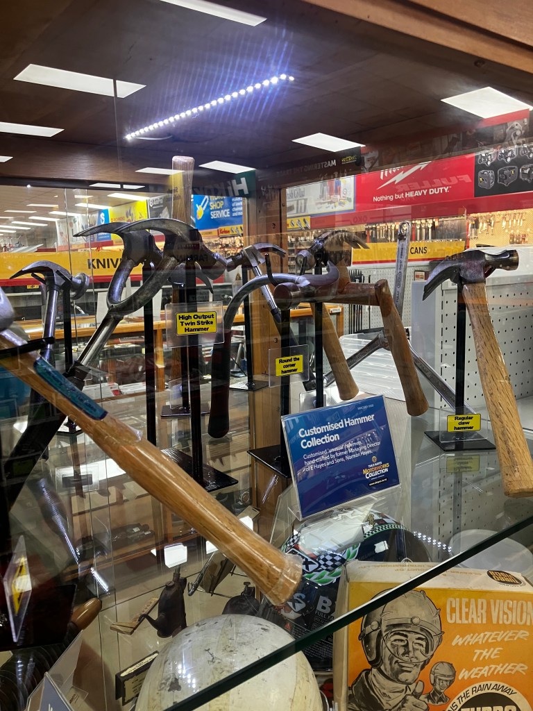 On the way past, I stopped by E Hayes Hardward store. It exists as part museum, with motorcycle exhibits scattered throughout the store. Also a hilarious joke hammer display!
