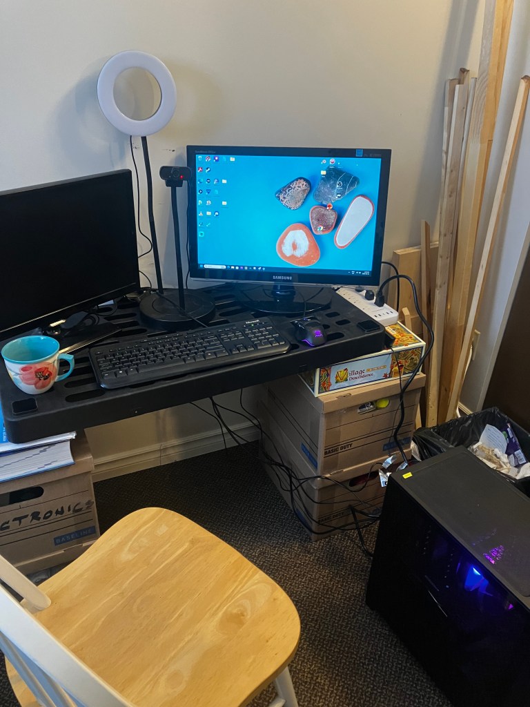 I pulled the trigger on Paul giving me my PC back. Of course, I have no desk, but Hanuman and Emily suggest I just pile up some boxes and lay a plastic shelf across them, cuz it only needs to fit and support the weight of my screens. Paul comes by and we chat for a bit. He lost one of my cables, the annoying one that I finally had to buy last year, HDMI to Display Port.