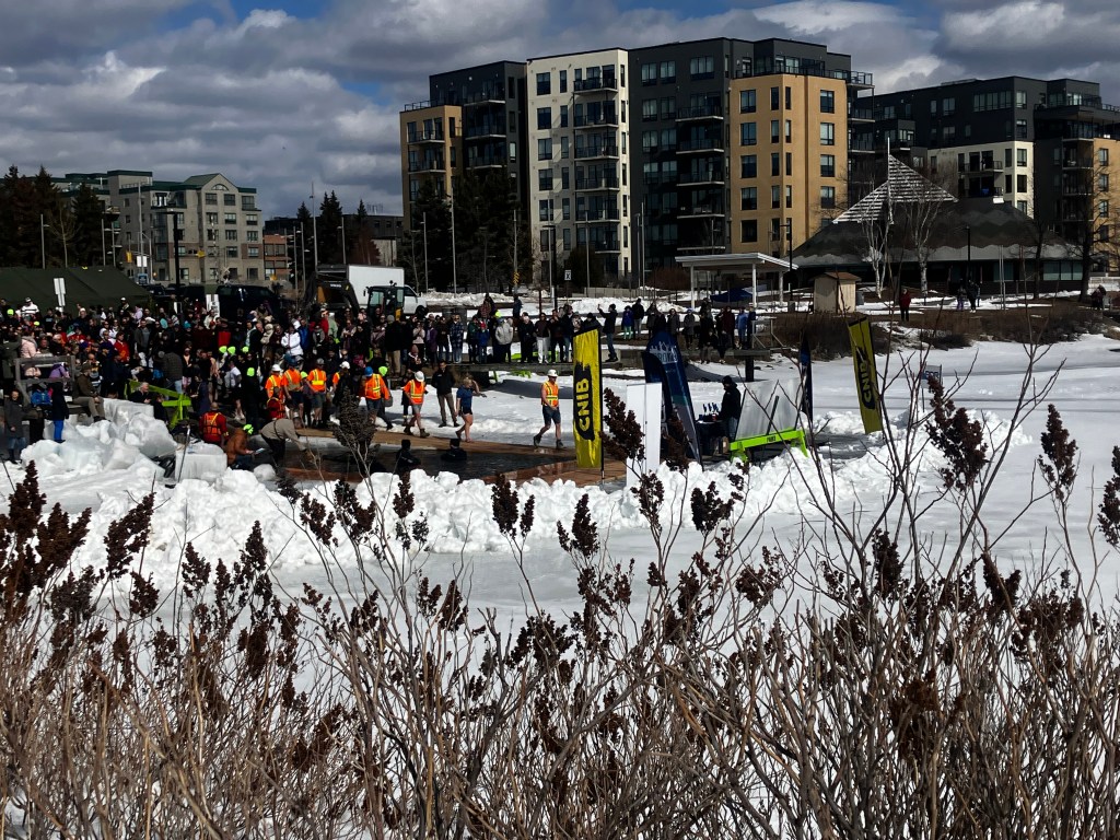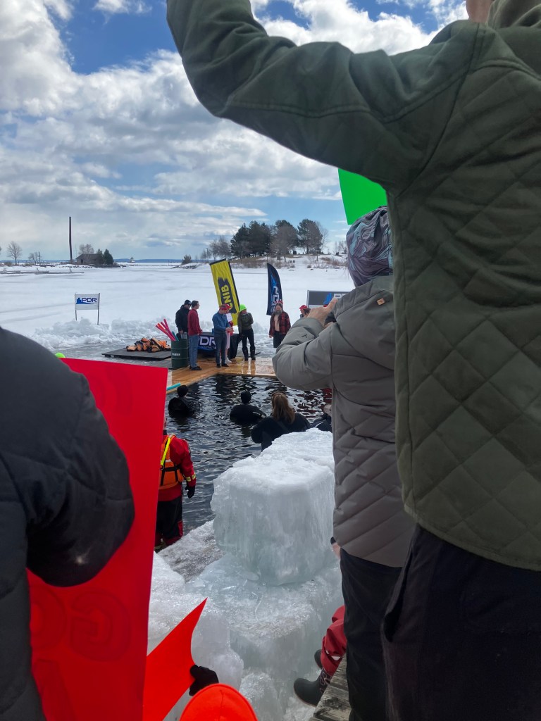 It’s cold out. I put up both of my hoods to keep my ears warm. I head down to the waterfront and follow the loud thumping bass until I find the polar plunge crowd. I wander around, half-expecting Kevin to randomly grab my arm and exclaim “hey Lucy!”, but I never find him. Maybe he’s getting here late. The event is going ’til 2, after all. I walk until I find a clear spot to stand, behind the hole in the ice, which has the ironic effect that I photobombed a lot of shots because of my hi-vis jacket.