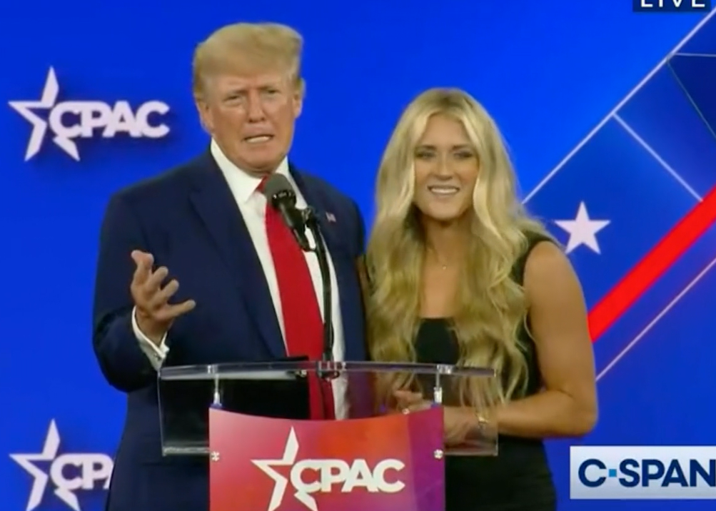 The one on the left is the orange man. The one on the right is collegiate swimmer Riley Gaines. She is 24 years old, 5 foot 9, and 136 pounds. She won gold in a 2022, 200 yard butterfly, among many, many other swimming accomplishments. But at the moment this photo was taken, Trump was on stage arguing that he could beat her in a swimming competition, merely because he is cis-male and she is cis-female.
