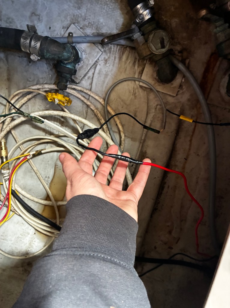 He had me install the bilge pump, I guess cuz I’m handy and my dad is an electrician makes me qualified. It was pretty simple to install. He offered me cable connectors, but I just used a pocket knife and electrical tape like dad would have done.