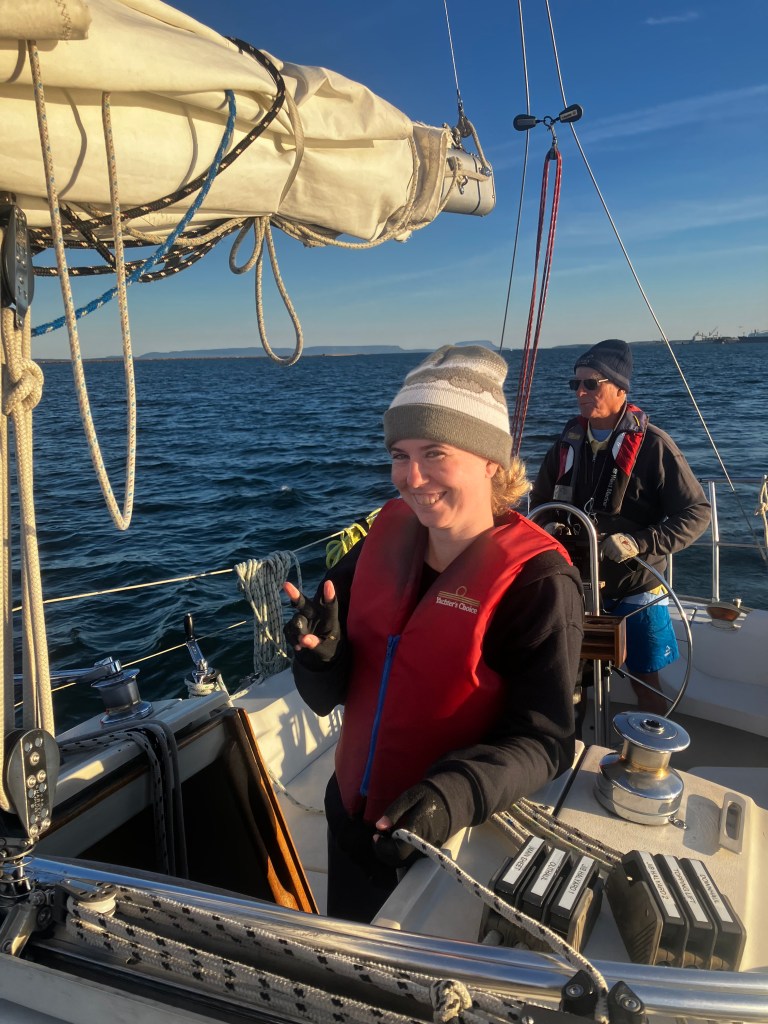 We were short-handed; some of the New Crew from Saturday hadn’t shown up, so we just had Kessia. Kevin was also with us. Chris put him on the jib with Kessia and I was put on the main, which I’d only done once, the last sail before I’d left.