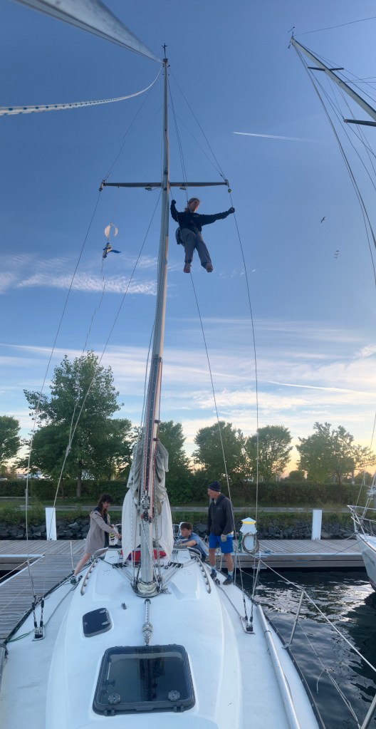 They tried to put up the spinnaker, but it wouldn’t go for some reason. It started raining and the wind was pretty light, so we gave up and motored to shore. I got sent up the mast… again… to see what was going on with the spinnaker halyard.