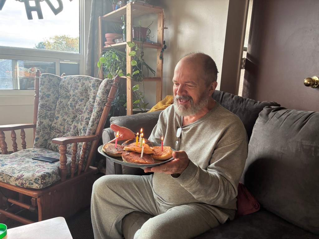 Me and Hanuman were up at the usual crack of dawn. It’s his birthday too, so we had a bit of a chuckle about it. Emily got up at some point in the night and hung up some decorations. When she got up for realses, we made pancakes and stuck candles in them.