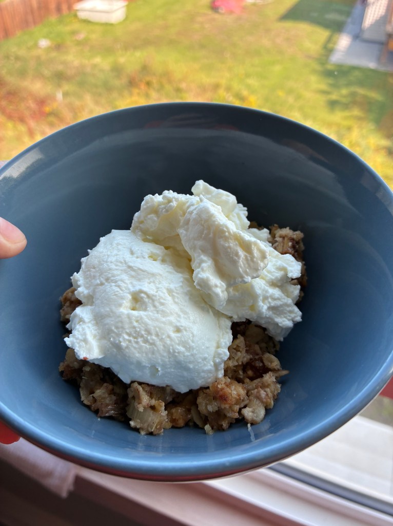It was ‘use up all the extras’ day. I had rhubarb from Kevin dying a slow death in the back of the fridge, so I made some rhubarb crumble. The yogurt was very good as a topping for the crumble! A forgotten box of Annies’ for dinner.