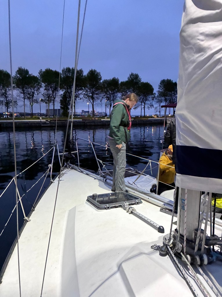 Emily wanted to try sailing, so I went home and had a nap (sleep eludes me) and hauled myself out of bed to go shiver my butt off in the wind. She’s pretty good at it, at least in crossing from one side of the boat to the other and staying out of the way. We had light wind and a lot of people, so I didn’t give her that much information; better not to overwhelm people anyway. The wind ended up being so light we were actually going 0.0 knots and drifted across the finish line from the action of the waves and not any momentum we had. It was dark by the time we were done but we hung around for an hour afterwards anyway.