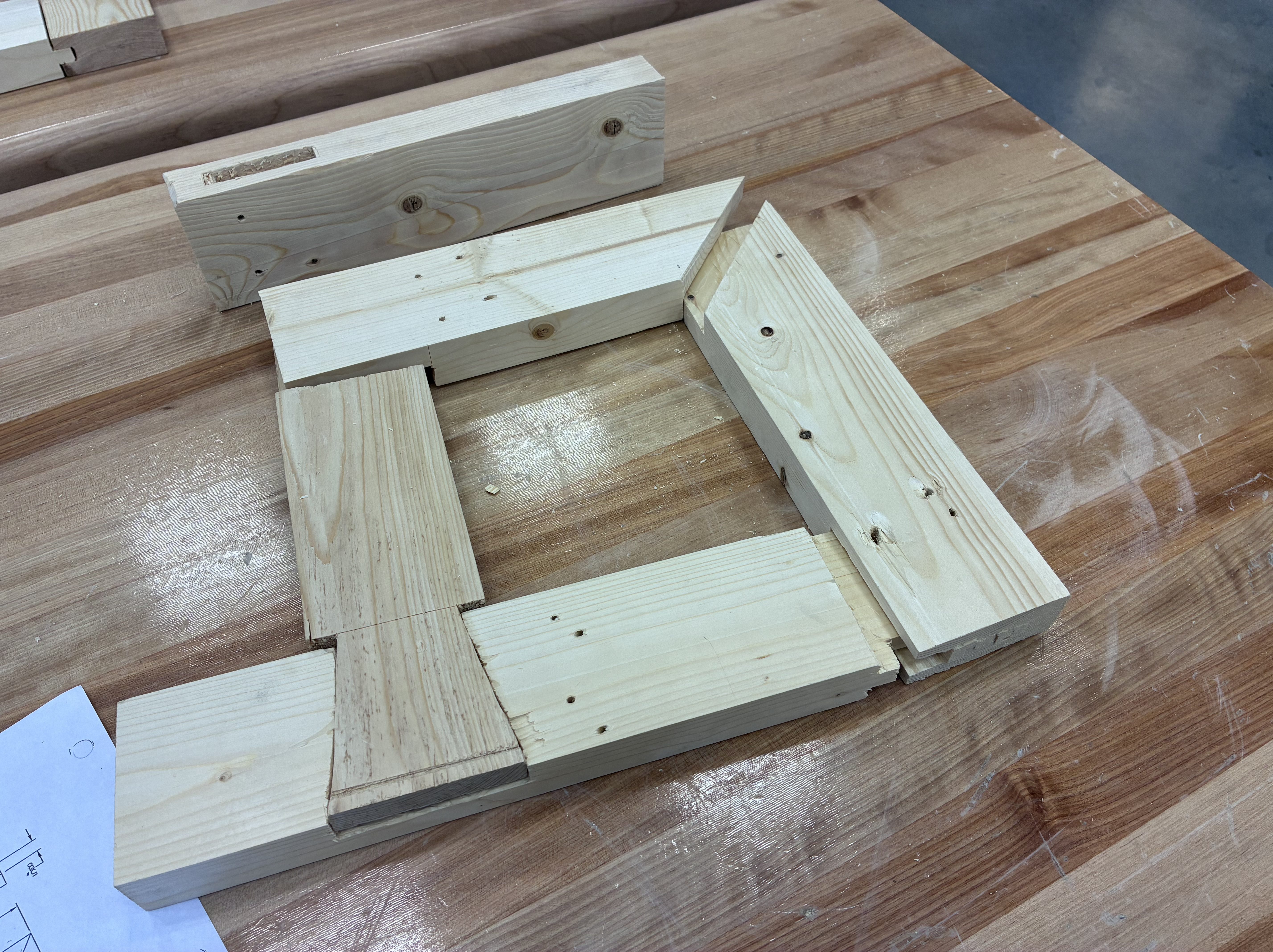 So we are making this square thing basically to practice some different joints. We were doing a half-lap, a dovetail, a half-lap at a 45 degree corner, and a mortise and tenon. It took us a couple days to do it, but I’ll include the finished picture now for context.