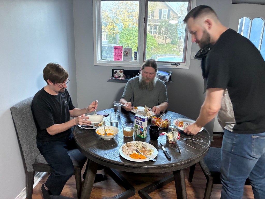 Ah, yes, our Thanksgiving dinner. “No, probably not. Just woke up.”