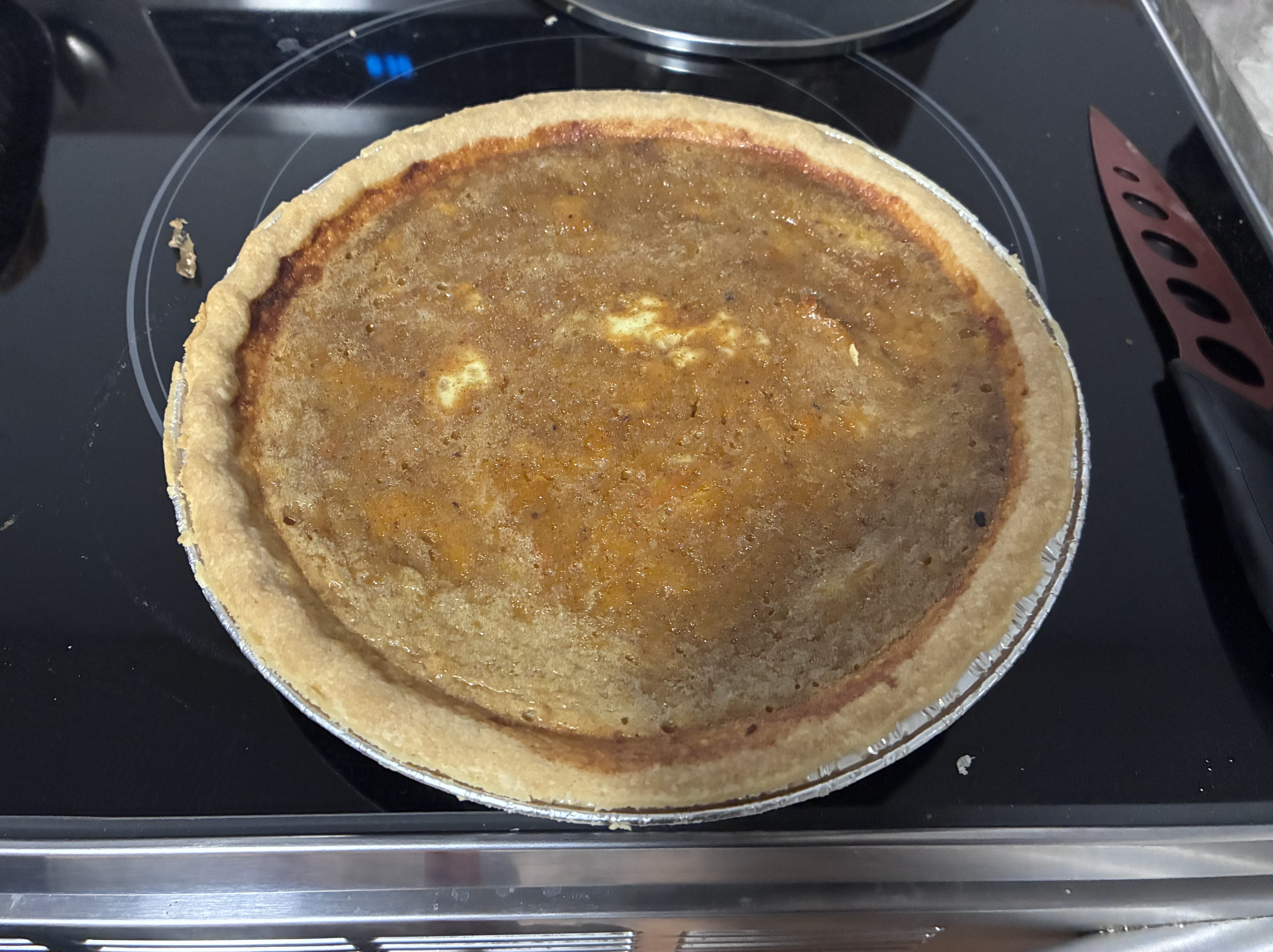 The turkey takes about half an hour extra, by which time John and Kevin had arrived and settled at the table. I set Jeremy on making mashed potatoes while I finished putting the pie together and threw it in the oven. To everyone’s surprise, Jeremy, who doesn’t own oven mitts, does own a meat thermometer.