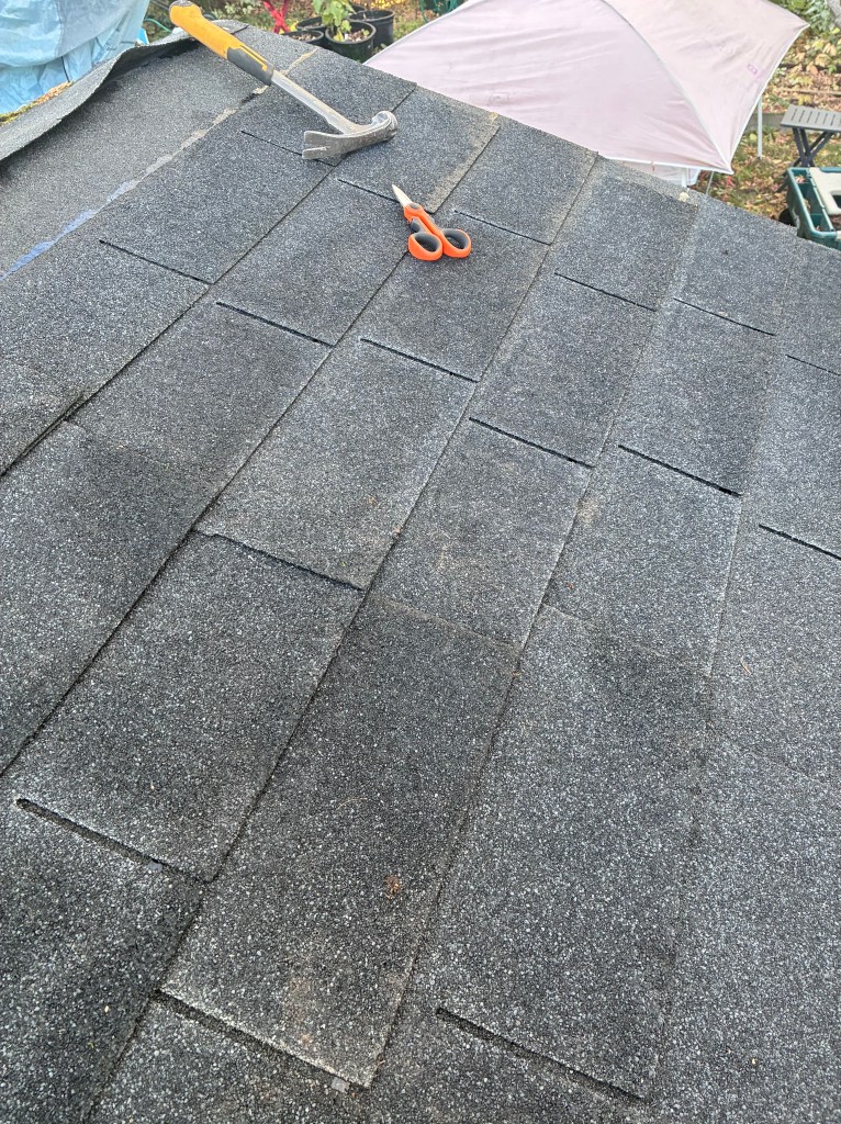 Kevin has to help me with this. Well, I could probably get it up onto the roof by myself if I had to, but I don’t have to. One sheet, two sheet. Mark the rafters. Leave 1/8 gap so the OSB can breath. I should probably bevel the edge, but the saw was crying just from cutting them lengthwise and I’m tired of hearing it scream. I’m also worried it’s just gonna crap out on me. Hammer down the vapour barrier and have Kevin hand me up the shingles. By this time, it’s 5 PM and my arm is starting to get sore and tired, but I’m determined to finish it today.