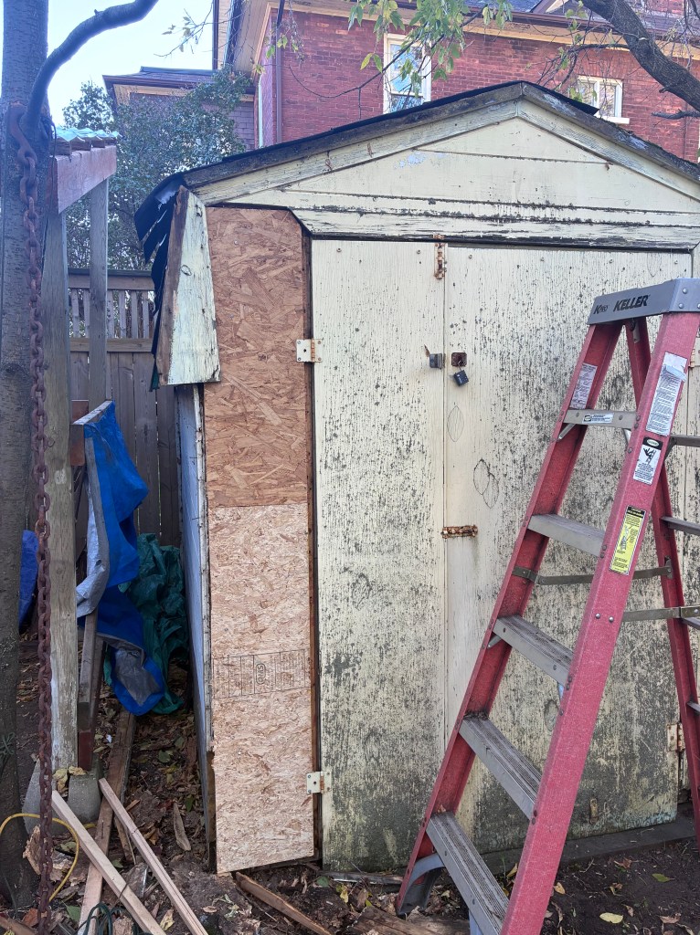 Throw the trim and the door back on. I ask him if he wants me to replace the siding, but he just shrugs and says it doesn’t need to be pretty, just waterproof. Well, that it is. Already my mind is drawing up plans for making him a nicer shed, with an attached woodshed because his current one has seen better days as well. Fix the deck. Lots of plans!