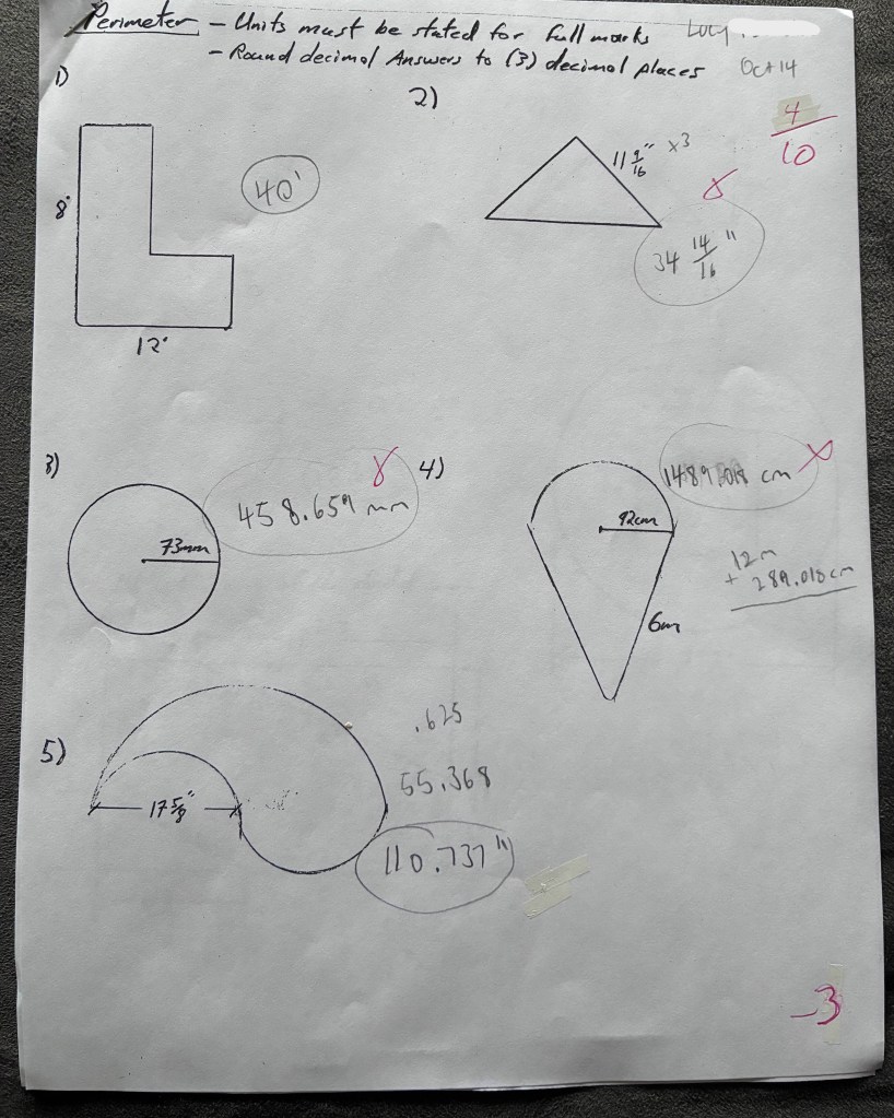 I didn’t study at all because perimeter and area are not hard, especially since we are allowed a cheat sheet of formulas. Unfortunately, it appears Landon was in a sadistic mood again, because the test we got is bollocks. I had a feeling as I was completing it that I was going to get a bad mark, but I couldn’t figure out what was wrong.