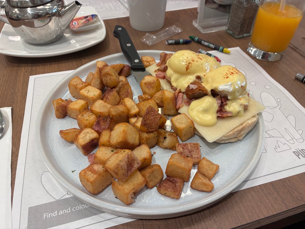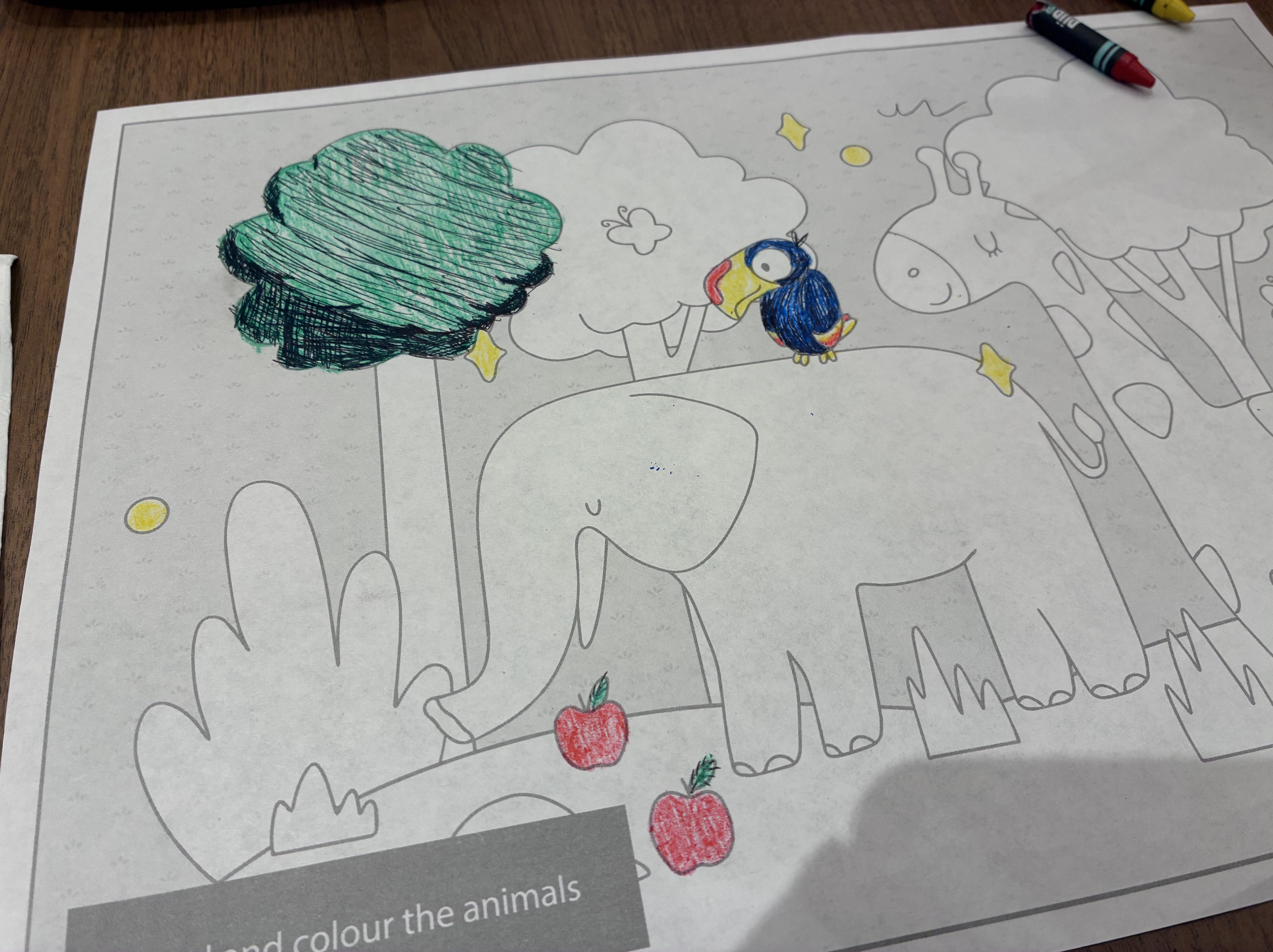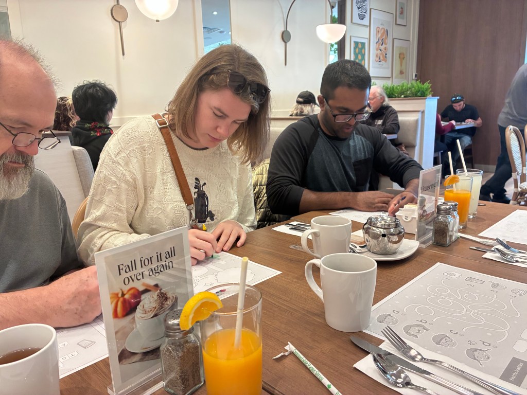 When Kev arrives, we discover the other side of our placemats are colouring sheets. We ask a waitress for some crayons and most of us start colouring!
