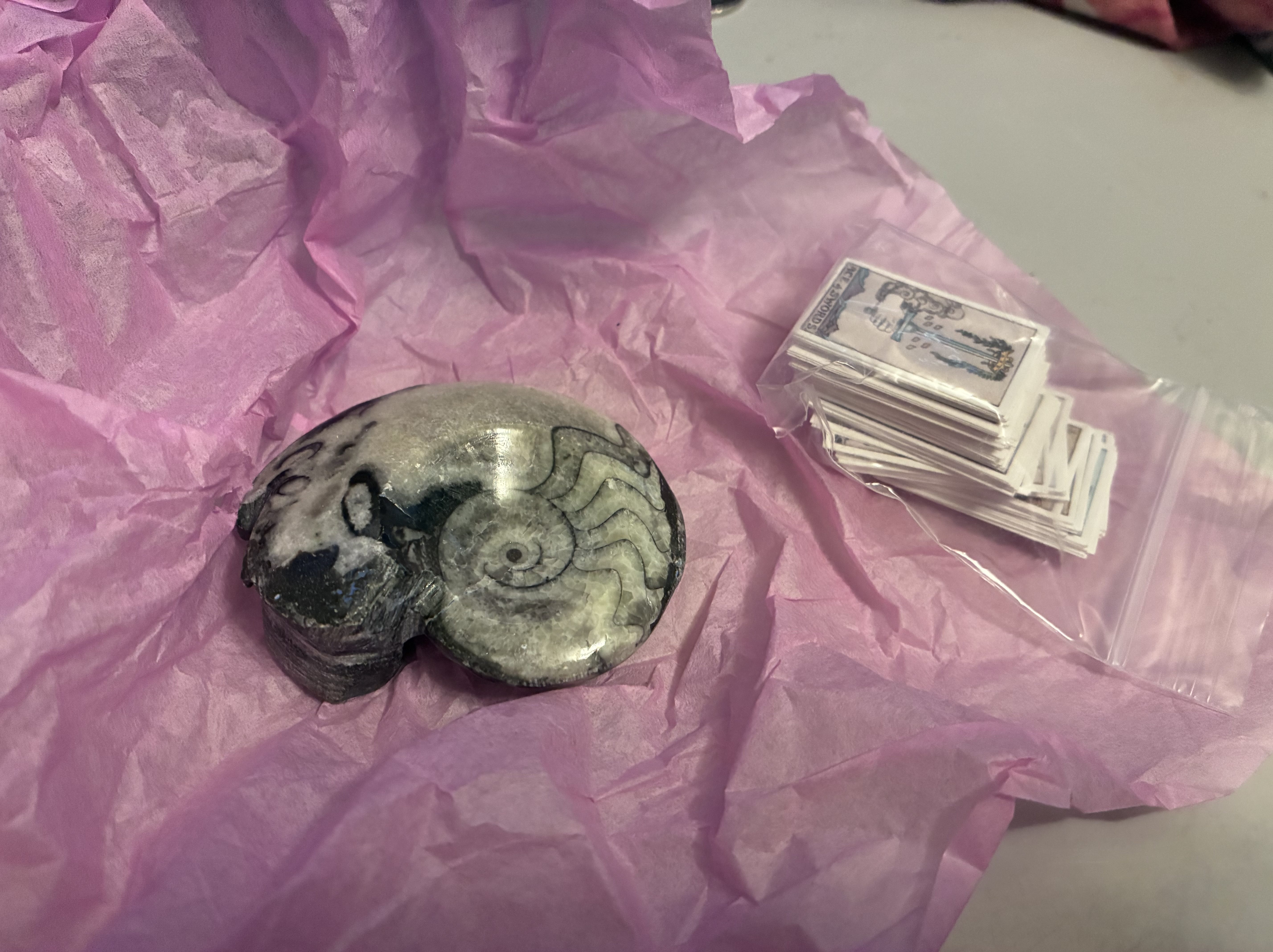 It was not what I was expecting. There was every kind of rock there, but also some New Agey stuff like tarot cards and mandalas. I was super thrilled and wanted to buy everything in sight, but of course that’s not logical. I limited myself to a single rock, carved in the shape of an ammonite, and a pack of thin Tarot cards no wider than my thumb, since they’d fit easily into my luggage.