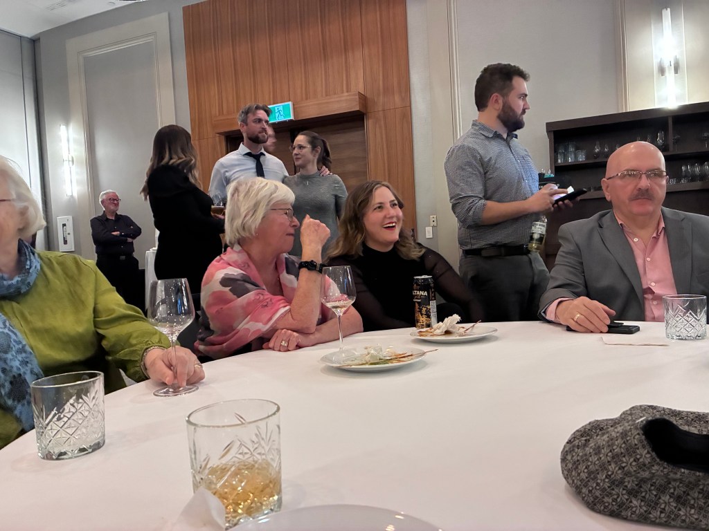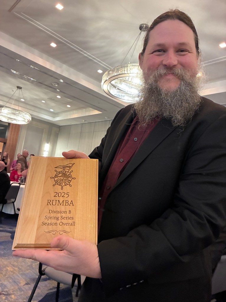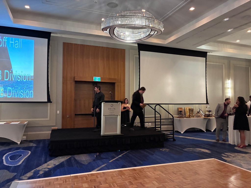 After hors d’oeuvres, the awards were handed out! Kevin had to accept the plaque for Rumba, as none of the rest of the crew were present. He asked me to take a picture for him, but then he grabbed the plaque and ran off the stage like he was being chased by wolves, so I grabbed a photo of him later.