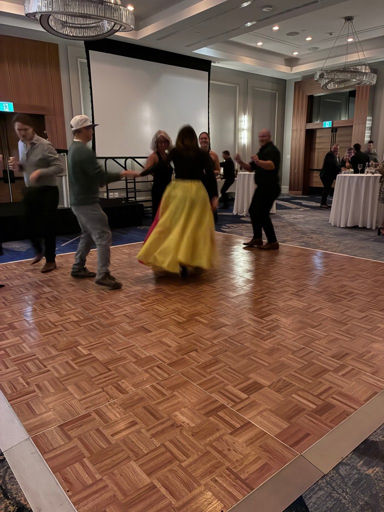 I’m in a dangerous mood. Casey’s set the bar for drunken shenanigans basically on the floor, so I can be a little more silly than I would usually. I grab Devin’s hand and drag him to the floor and teach him a basic two-step.