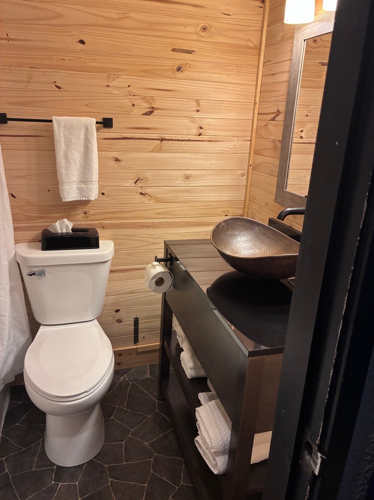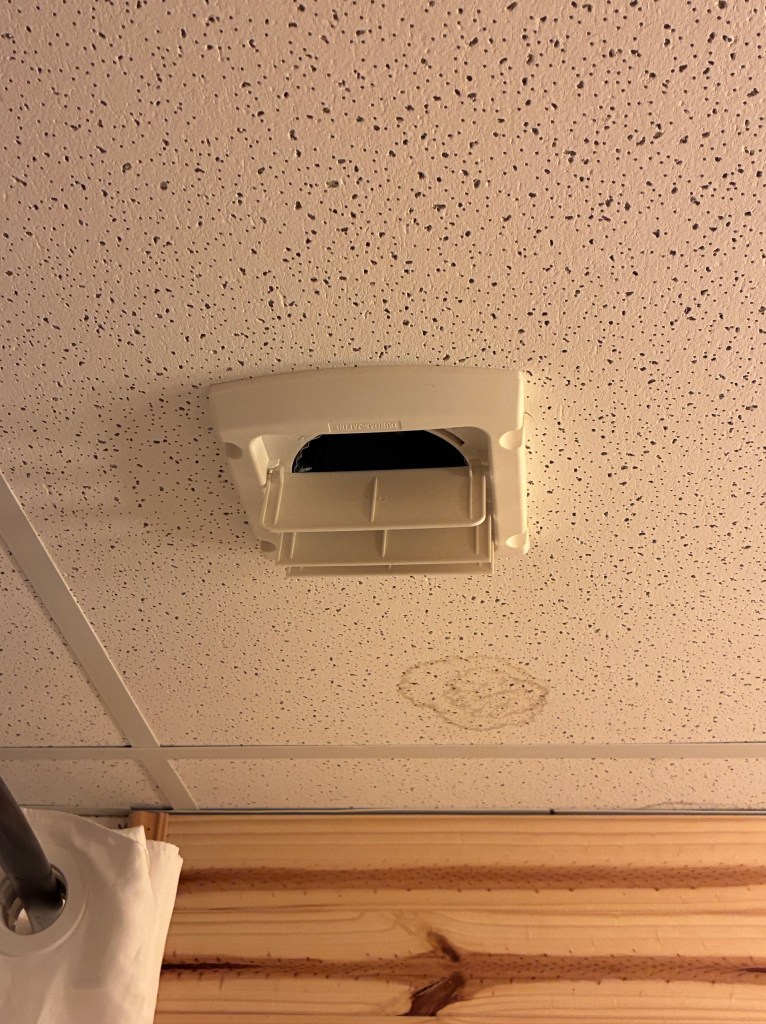 The bathroom is hilarious. Wood paneling walls – and I’d bet not water resistant wood – acoustical panel ceiling, no extractor and what appears to be a dryer vent in the ceiling. The paint is peeling off the door. The sink looks pretty but not functional, and the shower faucet was installed backwards, so the hot water comes out of the cold and vice versa.