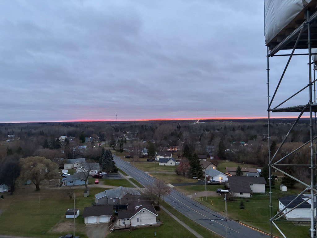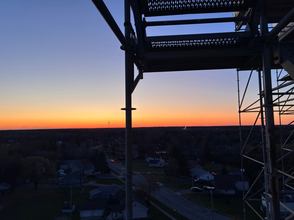 We drive down to the water tower. There’s no parking lot, but we can just park by the side of the road. There’s a small portable building that presumably serves as office and lunch room.