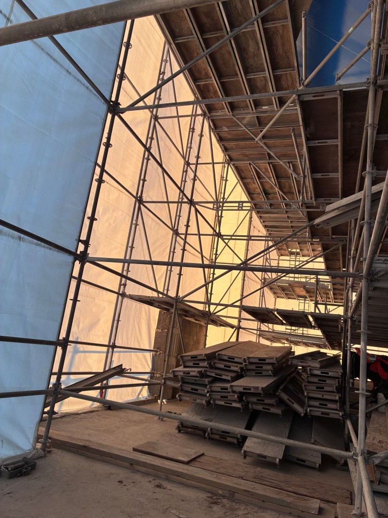 Once we had a bit decked out, Bart partnered me with David. The technician wanted a handrail and toeboard, and probably a red carpet too, so my job was to keep David supplied with ledgers as he went around installing them. David’s face went a shade of whiter when he was told; he’s really not used to being back on the tools again, but he did it without complaining.