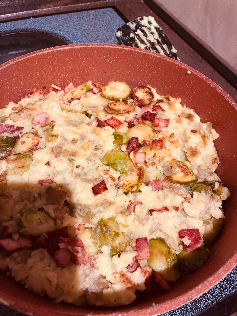 I boiled the potatoes Kyle left behind to make what the British call ‘bubble and squeak’, a perfect dish for using up leftover mashed potatoes after a feast. If you don’t have leftover mash, you do have to throw the newly-made mash into the fridge to chill before you can continue making it, but I just wanted a one-pot meal, which bubble and squeak is.