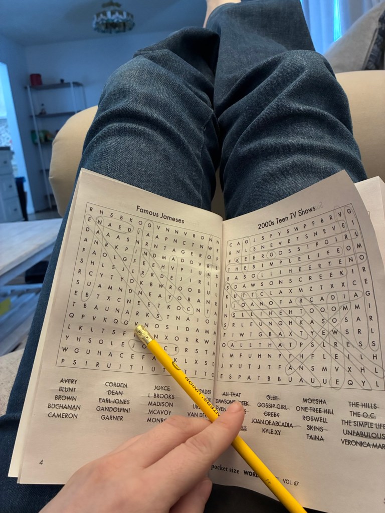 Whatever. Put on background noise on Youtube, make myself a hot chocolate. I can’t be bothered to go out. I haven’t had much of an urge to drink since I got here, but I pour a shot of the chocolate Crown that no one liked into it. Why not, it’s New Years. That means something, apparently. Curl up in a blanket with my book of word searches.
