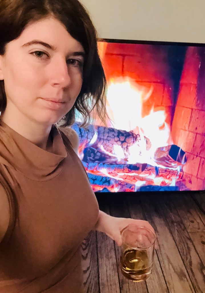 A wild thought enters my head. This 58 inch TV could be useful for a lot of shenanigans… I place it on the floor and put it on the fireplace channel, like a Bond villain. Why lounge on the couch when I can lounge on a tiger skin rug with a glass of wine?