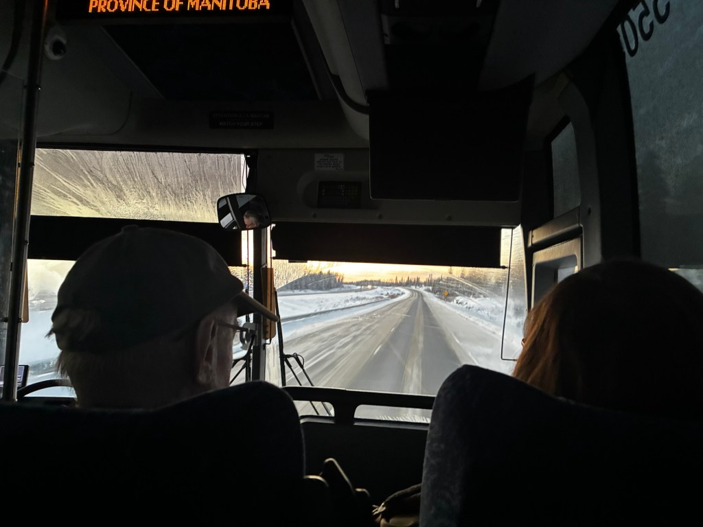 The bus shows up on time, although the driver won’t check us in until after his lunch, so we stand in the snow, shivering. The people getting on at Fort Frances include a couple visiting from New Zealand, and a lady who immediately starts trying to mother me. She’s brought a book about riding the train across Canada, so we talk about my imminent train trip.