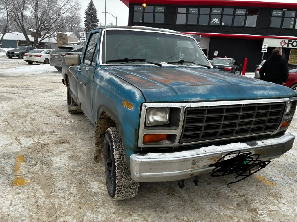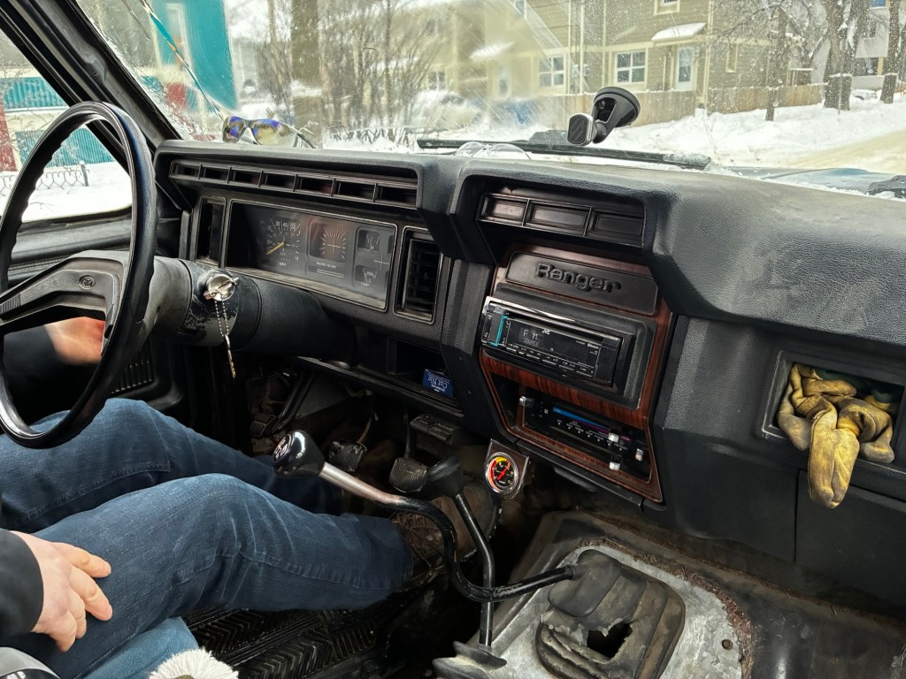 We walked down to the truck. He brought his ’83 Ford Ranger, and there was a hole in the sleeve around the stick so it was venting exhaust into the cab. We drove with the windows rolled down, drifting around the unplowed streets of Winnipeg.