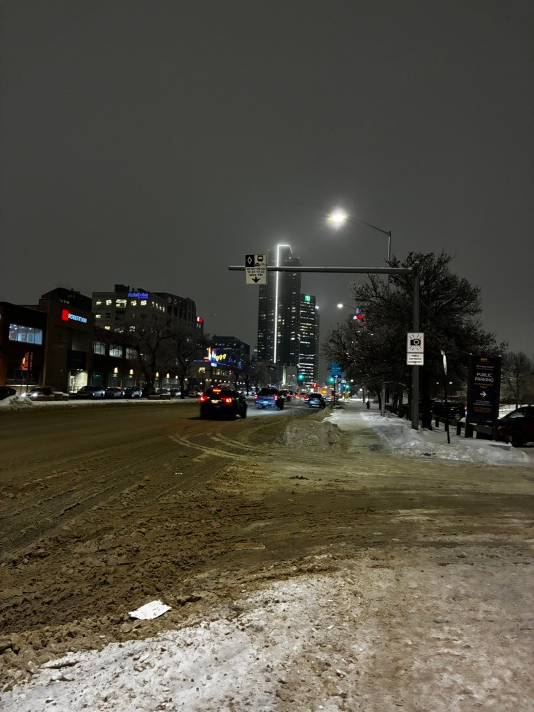 The sun was long gone by the time we pulled into the depot in Winnipeg. If it were summer, I’d walk to the Airbnb, but it wasn’t, so I ordered an Uber. The lady asked me where my gloves were and commended me on packing eggs in my grocery bag.