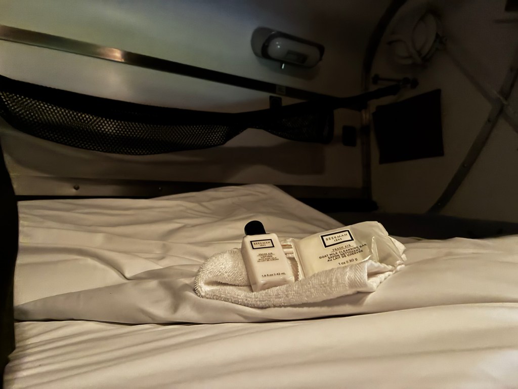 I hate sleeping with aids. In addition to the sleep mask, I found a pair of ear plugs in the shower kit. Of course, nothing can prevent me from being jostled awake by the train lurching to a stop.