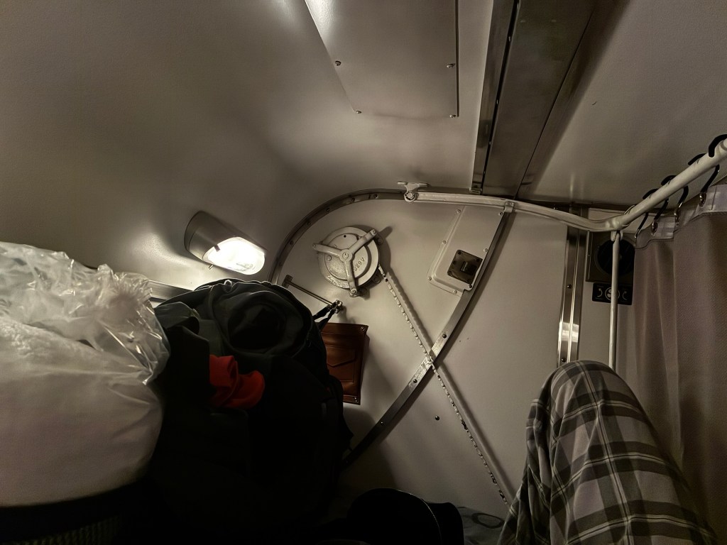 I realized the second problem with boarding at night; there was no one to explain what the eff was happening. I found my bunk – 2, upper – and was closely trailed by the elderly couple who were in the bunks opposite mine. Where do I put my bags? In a panic, I expertly flung them up into my bunk and clambered up the ladder quickly, to clear the narrow aisle.