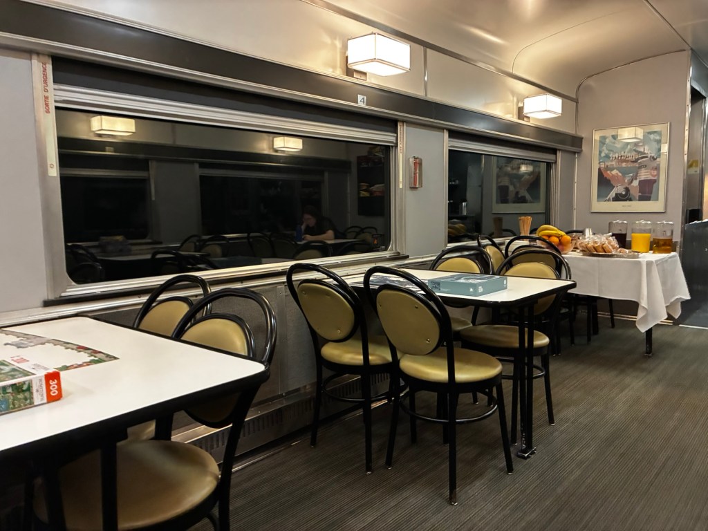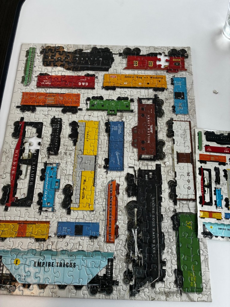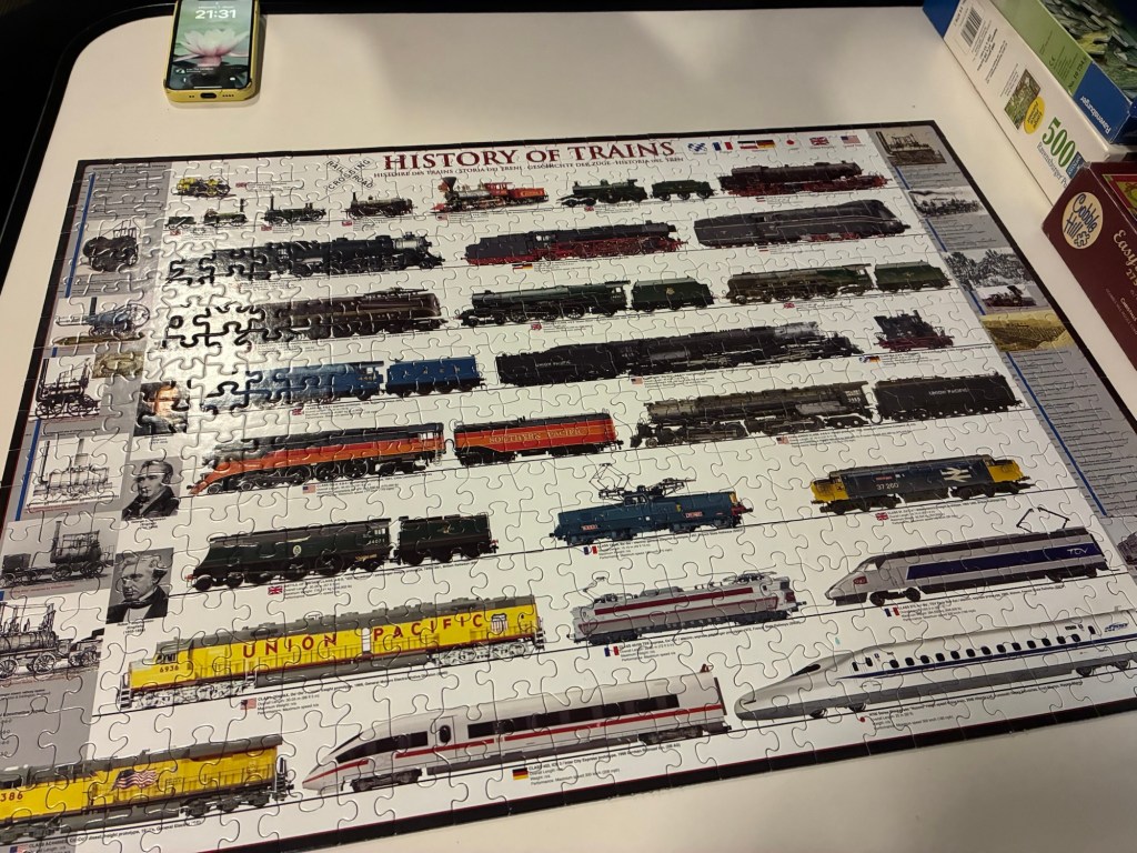 I settled down in the lounge with a puzzle, which took me about 2 hours to complete it. I went for the smaller 300 piece puzzle; I wasn’t sure if the conductor would insist on the tables being cleared. They were playing the episode of Mighty Trains about the Canadian.