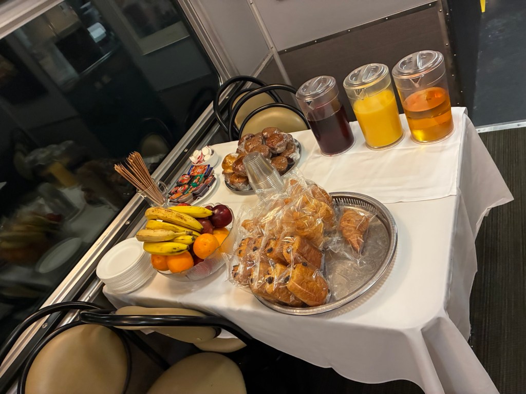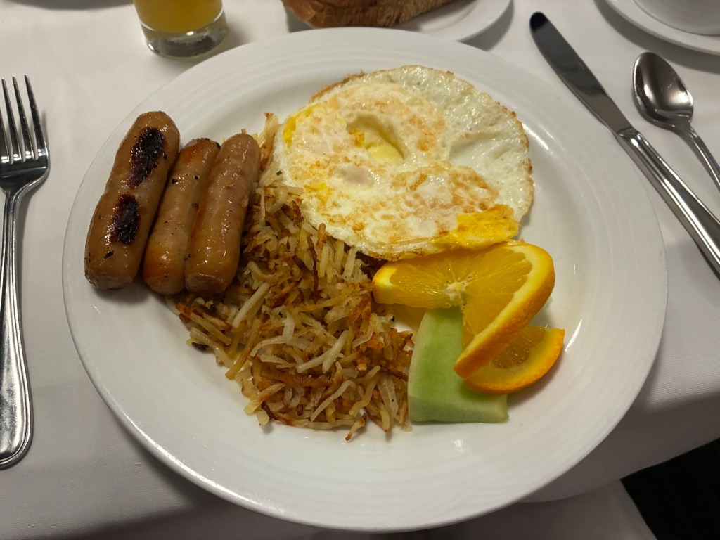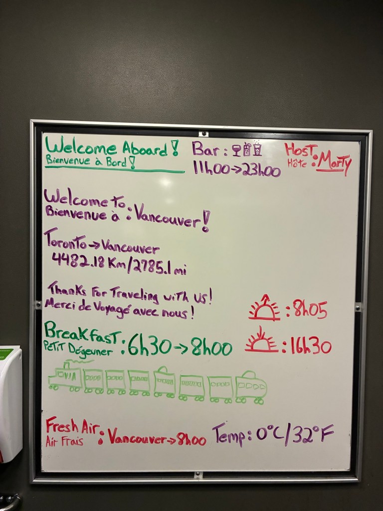 Because we were waking up in Jasper and they presumed everyone would get off the train, breakfast and lunch were changed. There was to be an “enhanced” continental breakfast, followed by an optional brunch between 9:30 and 12:30.