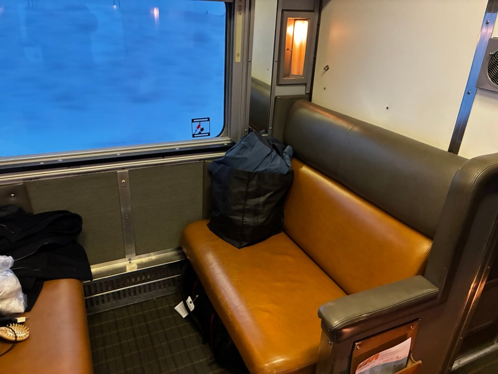 I slept restlessly. The curtain does not fully block sound or light, so I woke up around 2 to wrestle my sleep mask out of my bag. None of the guests were noisy, but the train clanks and groans and rattles. It also stops and starts with a jostle.