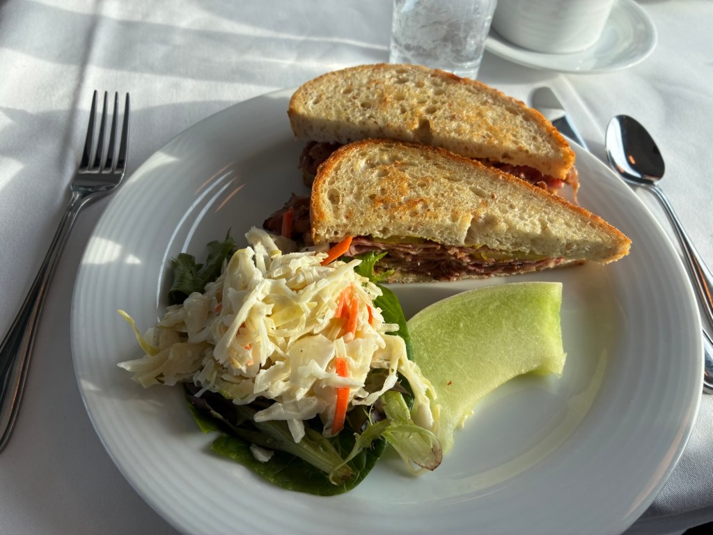 Around 11 I wandered downstairs for brunch. Which is just as well, because after I finished eating there was a rush. I went back to finish my second puzzle while everyone lined up in the lounge car for brunch.